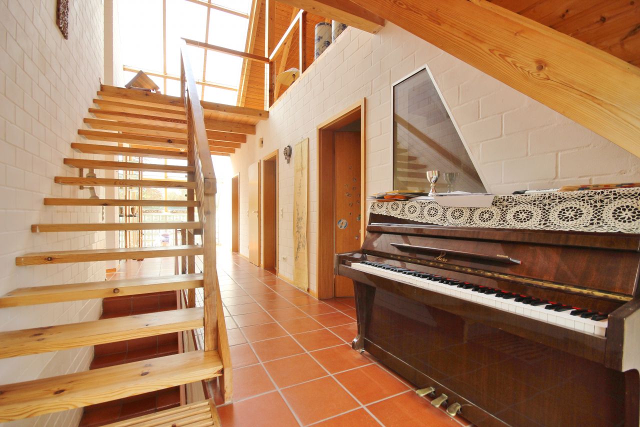 Im Wohnzimmer gibt es auch einen Essbereich welcher sich im Erker befindet. Dem Erker vorgelagert ist der ca. 18 qm große "Wintergarten". Neben dem Wintergarten ist die überdachte Terrasse welche ca. 20 qm Fläche hat. Die Terrasse kann vollständig geschlossen werden und ich habe ihr den Namen "Sommergarten" gegeben. Hier können Sie im Sommer bei jedem Wind und Wetter fast draußen sitzen und zum Beispiel grillen. Im hinteren Gartenteil wurde ein kleiner Gartenpavillion aufgestellt, welcher zum verweilen einlädt. In der Küche befindet sich eine Echtholzküche. Hier sind eine gemütliche Eckbank, ein Tisch und zwei Stühle aufgestellt. Über die mit pflegeleichter Auslegeware belegte Treppe gelangen Sie in das Obergeschoss. Hier sind das große Bad, ein Schlafzimmer und zwei weitere Räume zu finden. Dem Schlafzimmer ist ein Balkon vorgelagert und Sie können den Blick in den Garten genießen. Im Schlafzimmer ist ein ca. 3 qm großer begehbarer Kleiderschrank eingebaut. Bei den Fenstern handelt es sich fast ausnahmslos um hochwertige Holzfenster. Vor jedem Fenster finden Sie eine Außenjalousie. Über eine weitere Treppe gelangen Sie ins Dachgeschoss, welches gemütlich ausgebaut ist und über drei Fenster verfügt. Die Grundfläche des Spitzbodens beträgt 48 qm. Es gibt zwei Heizkörper, ein Elektroboiler und ein Waschbecken in dem Dachgeschosszimmer. Das Haus verfügt über einen Vollkeller. Sie haben zwei Außenzugänge. Einen vom Garten und einen von dem Stellplatz aus.