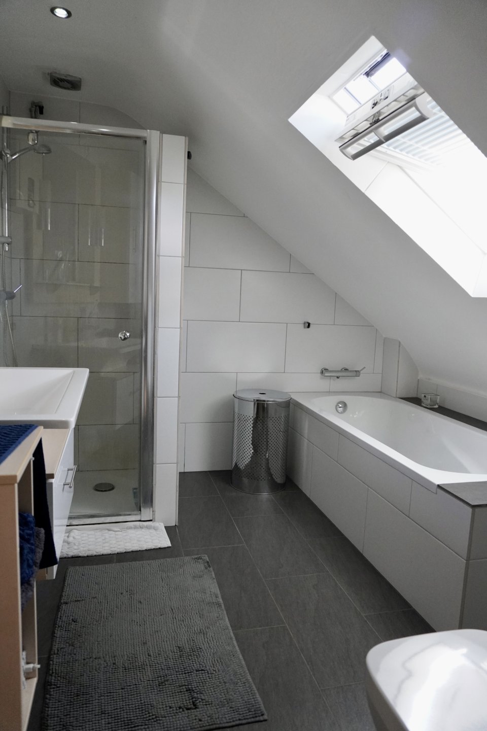 Im modernen, hellen Tageslicht Badezimmer befindet sich eine großzügige Wanne und eine tolle Regendusche. Zusätzlich ist der ganze Raum abgerundet mit LED-Deckenhotspots. Dieses sorgt für einen angenehmen Lichteinfall. Der Boden ist mit schönen, hochwertigen Fliesen verlegt. Darüber hinaus steht eine Garage zur Verfügung. Diese ist bereits in der Kaltmiete inkludiert und muss nicht mehr extra bezahlt werden. Damit bleibt die lästige Parkplatzsuche am Abend erspart und sowohl bei Wind und Wetter geschützt. Außerdem befindet sich neben dem Hauseingang ein extra zu Wohnung geordneter Wasch und Trockenraum. Sie haben weitere Fragen? Gerne stehen wir Ihnen telefonisch oder per Mail zur Verfügung.