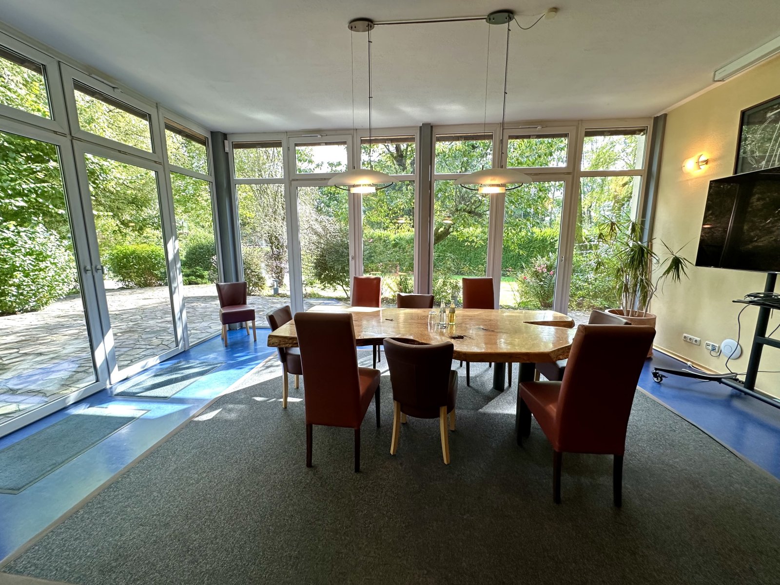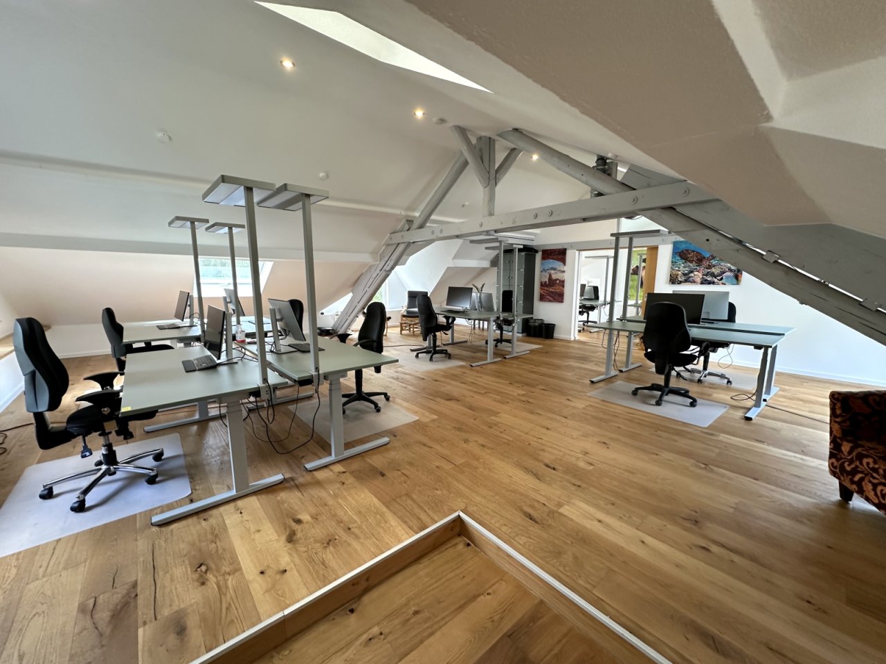 Auf knapp 600 qm Büro/Nutzfläche beeindruckt die moderne Inneneinrichtung mit besonderer Architektur. Die Panoramaaussicht aus der großen Glasfensterfront sorgen für das passende und besondere Ambiente auch für anspruchsvolle Kunden. Das Highlight ist der atemberaubende Ausblick in die Natur/Garten bzw. dazugehörigen Grundstück. Es gibt kein schöneren Ort für eine kurze Auszeit und seine Mittagspause zu genießen.